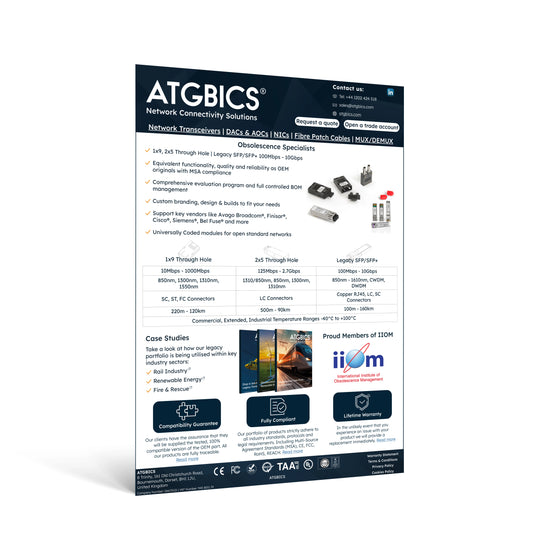 All our compatible transceivers meet the specification of the OEM product. We adhere to all form factor Multi-Source Agreements (MSA) to ensure interoperability and interchangeability between interface modules. Multi-Source Agreement (MSA) is a multi-vendor specification that defines the form factors and interfaces of an optical transceiver. This compliance enables compatible manufacturers such as ATGBICS to provide the equivalent functionality and quality as the OEM product.